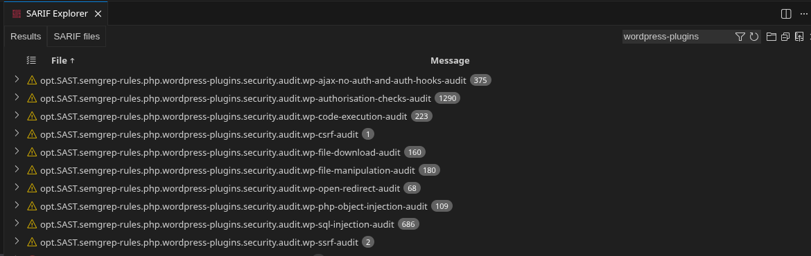 --config /opt/SAST/semgrep-rules/php/wordpress-plugins/security/auditsemgrep scan using the default wordpress security rules